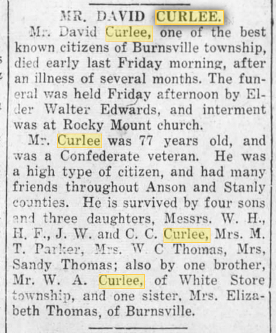 Davidson Curlee in 1860 lives in Burnsville Anson North Carolina with his father Enoch and mother Lucy in dwelling 38. He is 15 years old and his siblings are present: John, William, Elizabeth and Ransome. Sarah Hudson Curlee, 75 years old, Enoch's mother and Davidson's grandmother, also lives in the house.